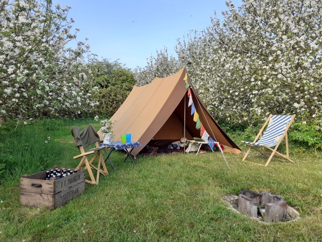 Sorry, no dogs or other pets. Please contact us if you wish to bring an assistance dog. Please ask permission before inviting guests that are not staying on the site. Our pitches are also not suitable for camper vans, or tents wider than 5 metres in their shortest dimension (due to the apple trees!). Strictly no drones please, due to livestock and our airstrip these can be extremely dangerous.