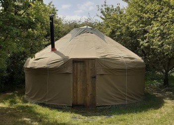 Sleep under canvas in comfort in our 16ft yurts, Oak Yurt (white canvas) or Chestnut Yurt (olive canvas) in our beautiful Cambridgeshire orchard.